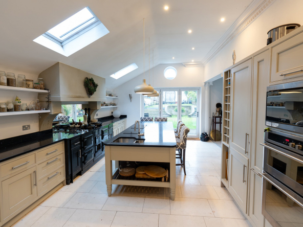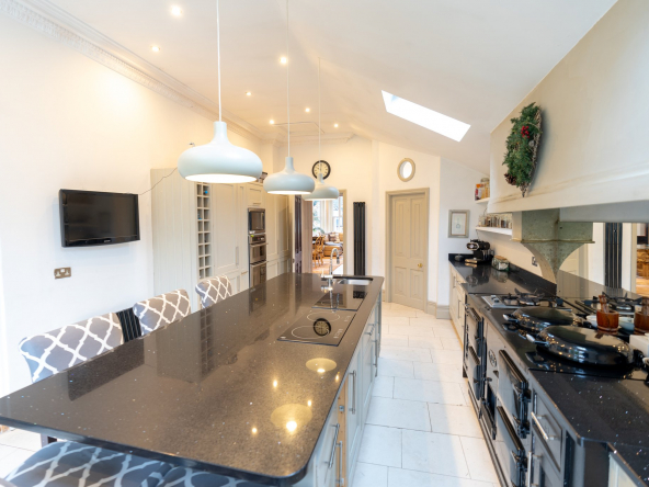 The kitchen affords a huge granite island, with built in sink and 4 built induction hobs. The work surfaces either side of a circa 1930 restored Aga, match the granite island. Intergrated fridge/freezer and oven /grill are housed in a bank of units, hand painted in Farrow and Ball light stone.