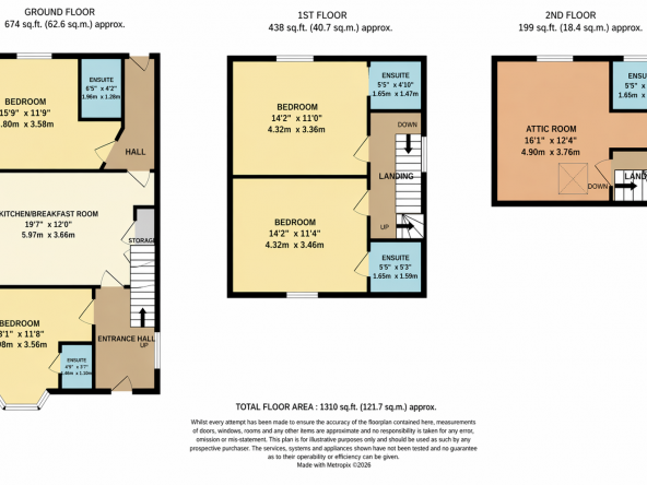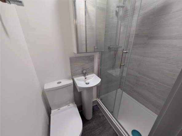Each ensuite is fitted with a three-piece suite comprising a low-level WC, wash hand basin, and shower cubicle, along with a heated towel rail and extractor fan.