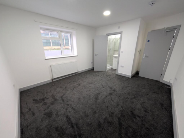 Spacious ground floor room with rear window, radiator, and private ensuite.